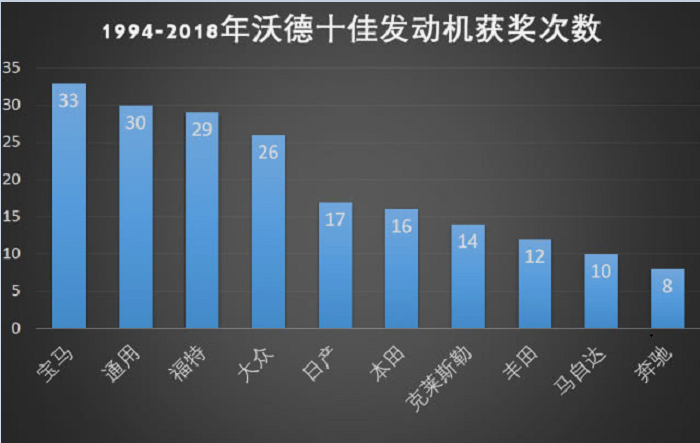 通用共获得了30次沃德十佳发动机称号,通用旗下的发动机也是以大功率为主,目前通用旗下最知名的发动机是Ecotec系列,技术水平在全球都是顶尖的。不过通用的发动机在中国并不常见,所以通用排名前三,也是受到了很多争议的。