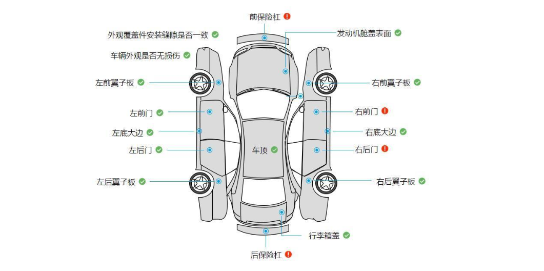 常规的检查部位就是上图所标注的部分,首先检查的就是车身的覆盖件,一般情况下验车人员检查的时候都会携带漆膜仪等设备,对于车身哪里有过刮蹭,哪里油漆做过修补一般情况下能检测出来。这里要说明一点,外观覆盖件上的损伤,并不会被定义为事故车,通常二手车商口中的事故车,是指的有机构性损伤后修复的,而不是指车身覆盖件,所以各位车友在出手的时候不要被不良商贩欺生“忽悠”了。