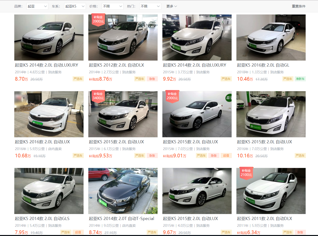 确定完基准价格后,我们就要根据车辆的情况进行一定的调整。首当其冲的就是使用年限和使用的里程数,相信不少朋友已经注意到了,在K5的挂牌价格的截图当中, 标价最高的为10.16万元,虽然和其他车同样是2015款车型,但这位车主出手的车辆上牌日期是2016年,也就是车辆的年限更短一些,价格上就有了明显的区别。