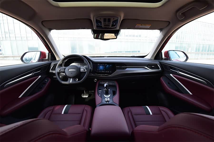 内饰部分中控台采用了飞翼式设计,也是和哈弗F7X一样微微向驾驶员一侧倾斜,中控大屏是采用嵌入式布置与仪表盘融为一体,许多功能按键集成在换挡杆的左侧。