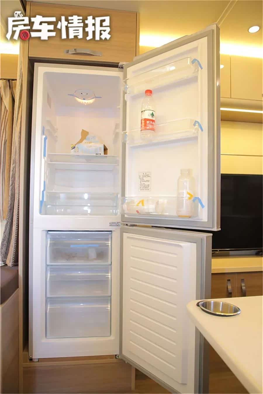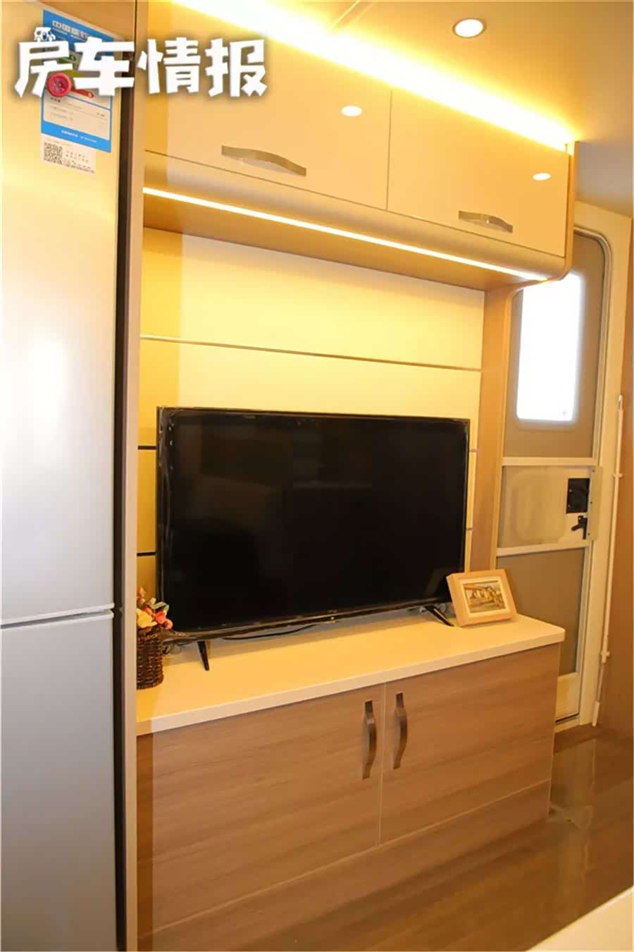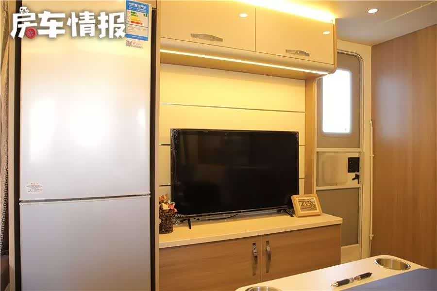 沙发周围是一套生态板家具的组合柜,包含了冰箱柜、衣帽柜、电视柜、洗手盆柜以及吊柜。本车自身配备了一台182L超大家用冰箱,包括了冷藏和冷冻区域,保证您可以随时品尝到最新鲜的食材。还有一台43英寸小米高清电视,给乘客在旅途中提供随时随地的欢乐。