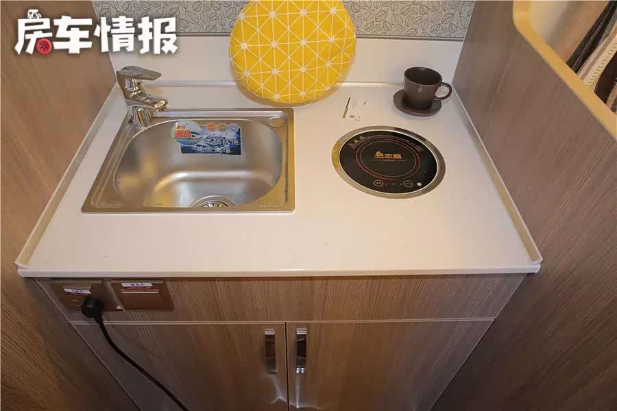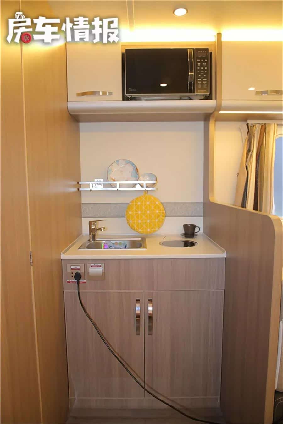 车门的对侧是厨房区域,本车为您准备了电磁炉,洗菜盆,独立水龙头,微波炉等设施,您在这里可以品尝到家的味道。
