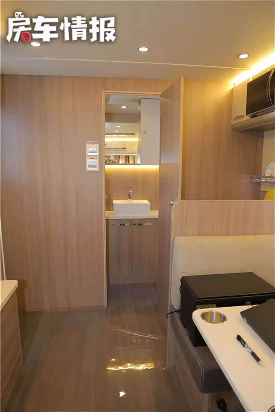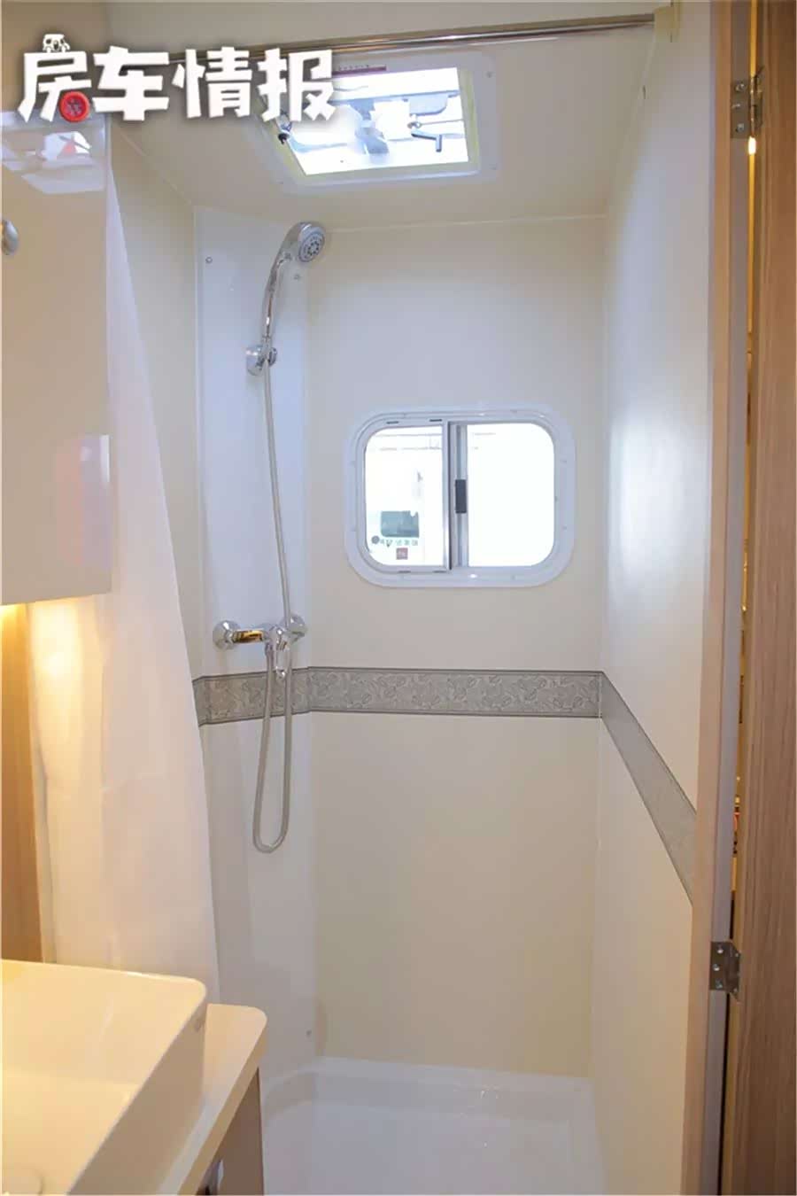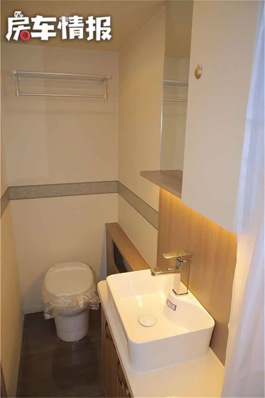 车身尾部是干湿分离的卫浴间,卫浴间里有专用坐便器,洗漱盆,花洒,毛巾架,隐形晾衣绳,双向换气扇等设施,干湿分离的人性化设计让出行变得方便自如。