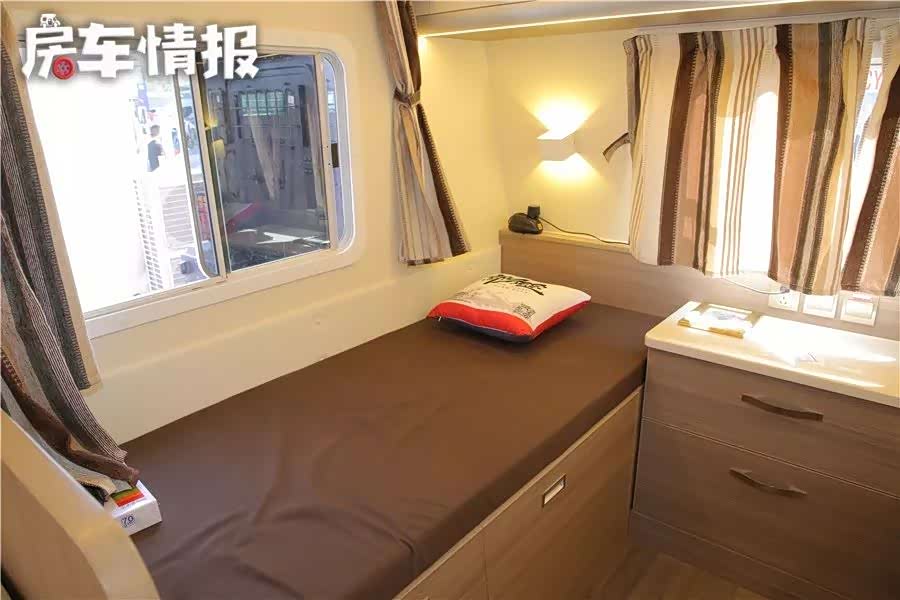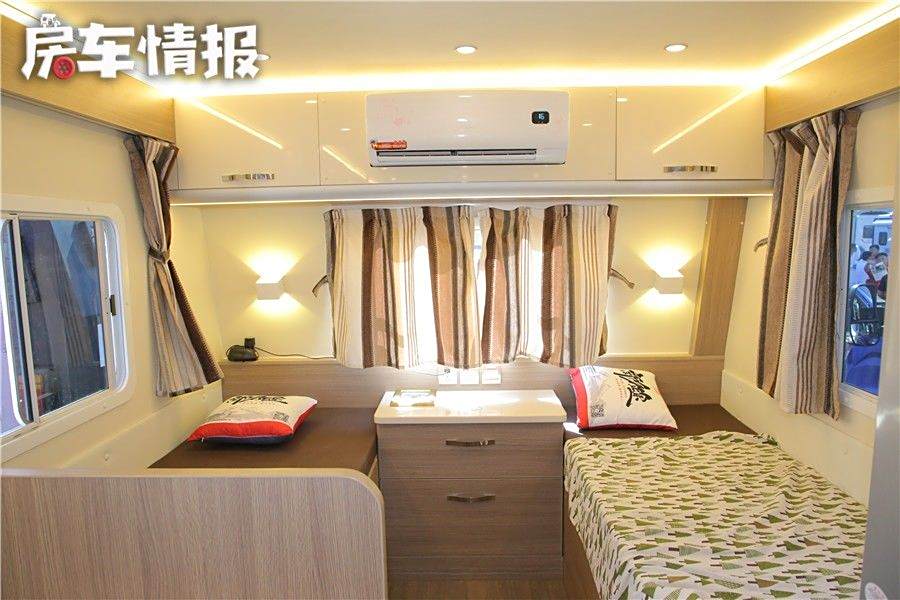 车身的前部为主卧区域,左右两边各有一张单人床,也可以将二者拼成一张大床,选择的多样性,满足了乘客们不同的需求。每个床头上面设有床头灯同时还配有家用空调,完全不用担心黑夜和室内温度给您带来的困扰。