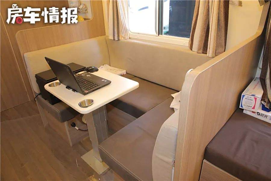 车身内部的中心区域是会客区,沙发选用的是U型沙发,U型沙发最大的优势在于乘坐人数多。沙发的餐桌是升降式,降下后可以拼成一张单人床,合理的空间运用给您带来的是最根本的享受。