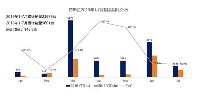 今年前七个月累计销量破两万,要知道去年全年,特斯拉在华累计销量也就只有1.4万余台,前7个月累计销量同比增长了146.6%,分月同比走势如下所示。