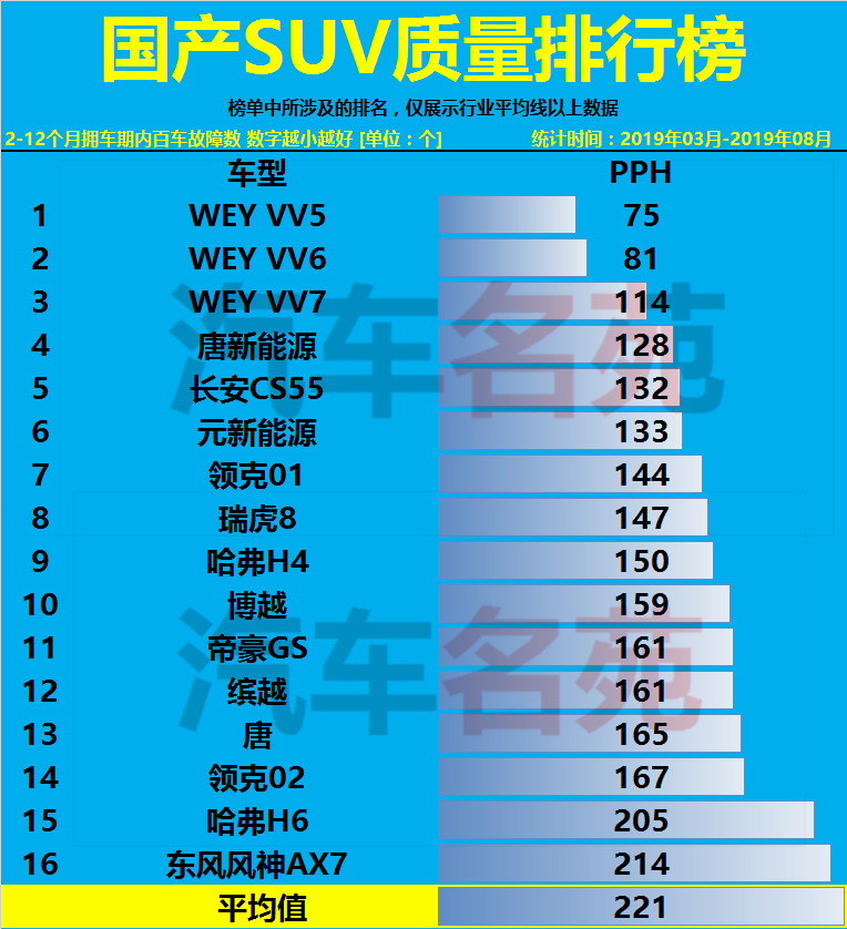国产SUV质量最新排名:(榜单只显示了质量水平高于平均值的车型)