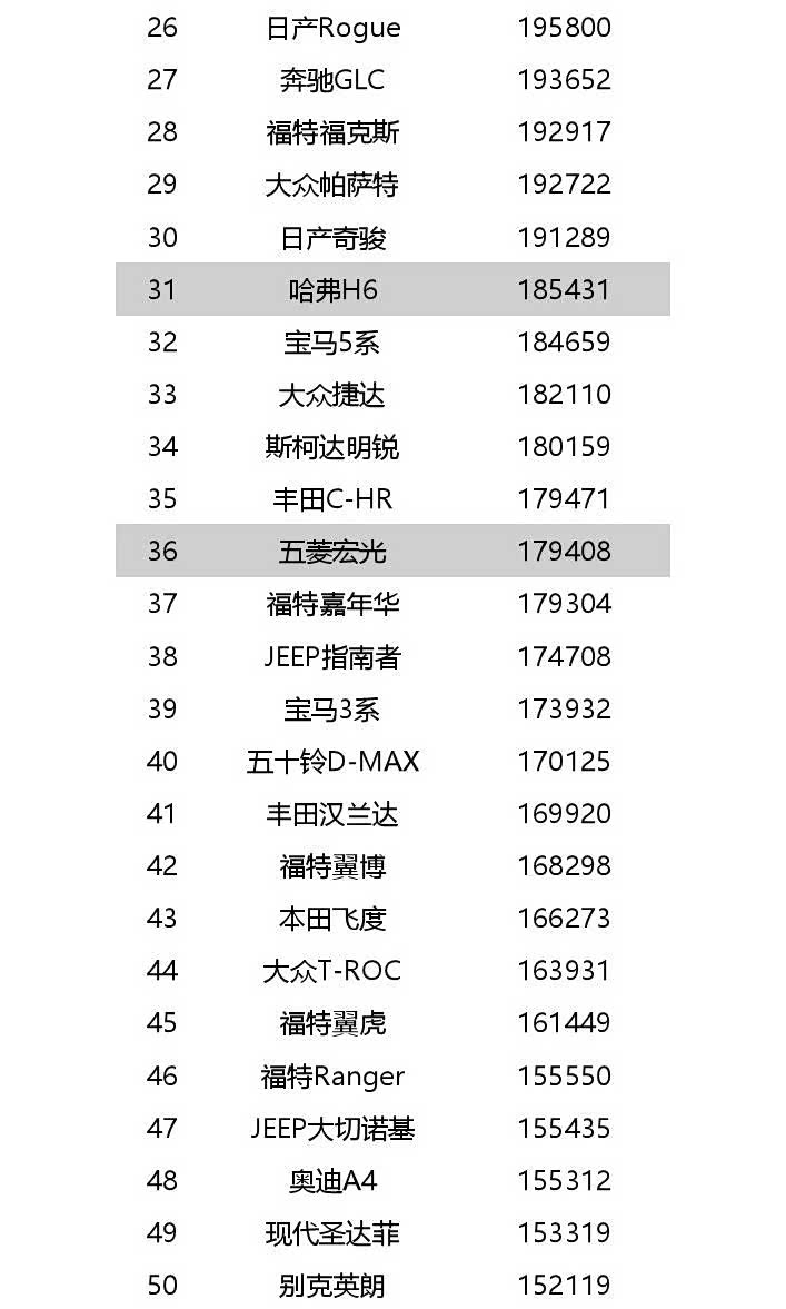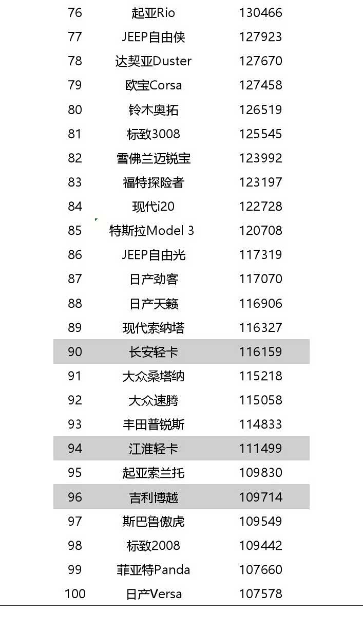 最后,排名第96的是吉利博越,以半年10万辆的成绩,成为了自主SUV除了H6之外,唯一上榜的车型。至于国产轿车,则全军覆没。没有一款车型上榜。