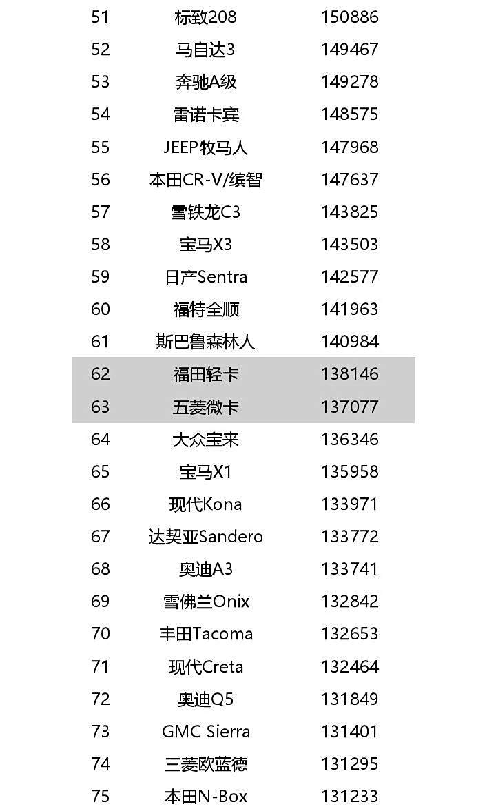 再往下的两款车型,可能会出乎大家意料,分别是排名62的福田轻卡,和排名63的五菱微卡。轻卡和微卡车型,我们平时关注不多,但这却是很多家庭的致富帮手。