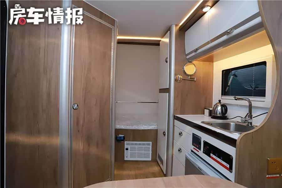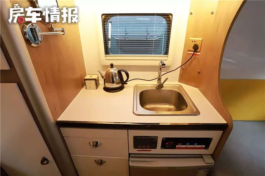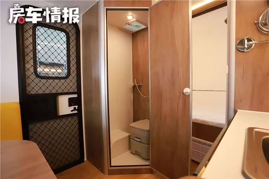 独立卫生间带一体式防水底托。标配顶部换气扇、淋浴花洒和便携式移动马桶。车轮拱的位置正好在卫生间内,设计师巧妙的设置为一个坐凳,方便老人小孩坐在这里沐浴,十分贴心。