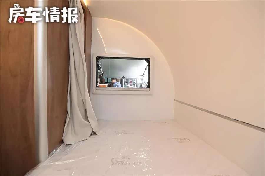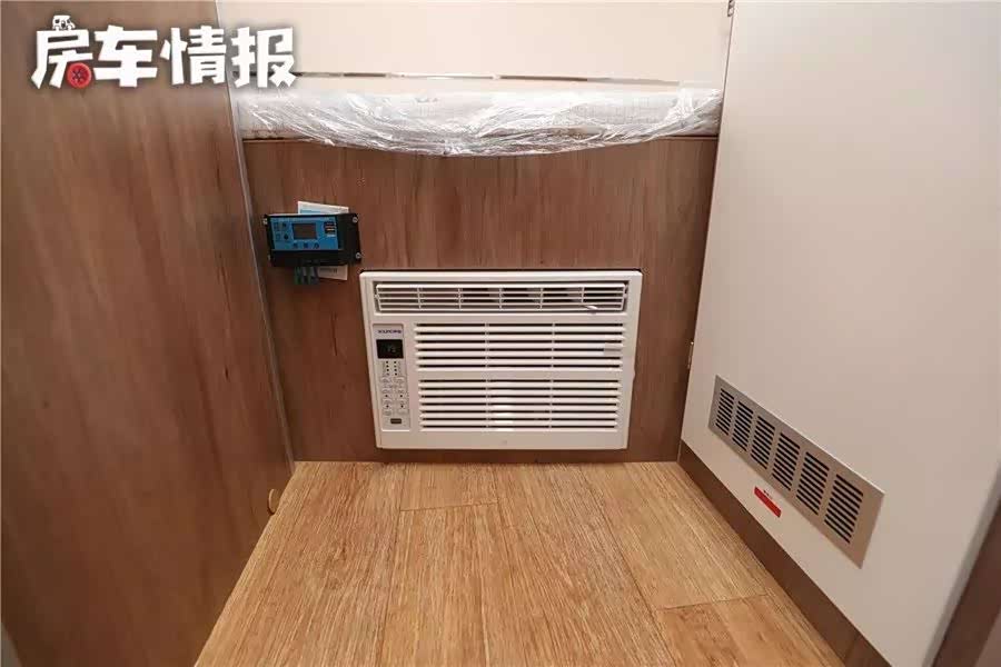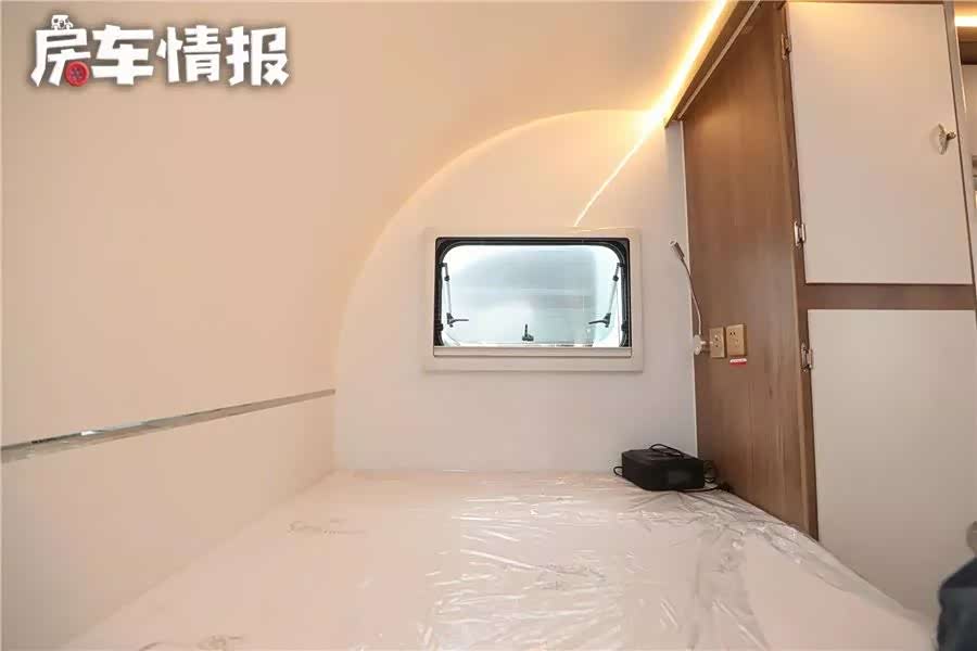 车厢最后部是另外一张卧床。2000*1250(mm)的尺寸可以容纳以一大一小两名成员。拱形的车体为床位提供相当不错的头部空间,躺在床上不会有压抑感。床位下方的1P车载单冷空调可以让你在炎热的环境下也能拥有一个舒适的就寝温度。