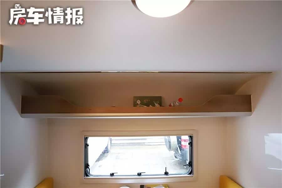 进入车内,整体风格清新淡雅,非常符合这款房车小精灵的称谓。前部对卡座和折叠桌板构成了餐厅,折叠组合后可变成一张2000*1000(mm)的单人床。上方的储物格长度也近两米,可以存放不少行李物品。亚克力双层外推窗包含纱帘纱窗,隔音隔温效果不错,既能通风换气也能保证就寝休息的私密性。