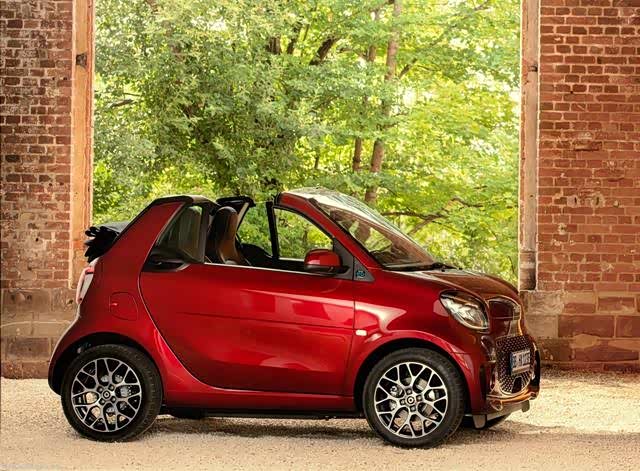 外观方面,新款车型与现款smart EQ大致相同。最大的变化来自于前脸部分,新款车型的中网下移,且面积显著提升,形成了"大嘴"的视觉效果,也让这款可爱的小车从前脸部分看上去根本不像是一款电动车型,再加上大而有神的前大灯,整个前脸都看上去更具时尚感和视觉冲击力。此外现场还展出了smart EQ fortwo edition one敞篷版车型,其采用了独特的轮圈,尾部扩散器也配备了红色饰条。