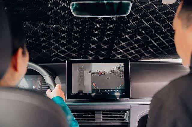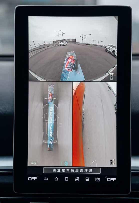 在试驾的过程中“E车汇”重点体验了全息透明影像系统,通俗的说就是透明底盘概念,该系统主要通过车身上搭载的摄像头以及算法实现透通过中控液晶大屏洞察车底作用。