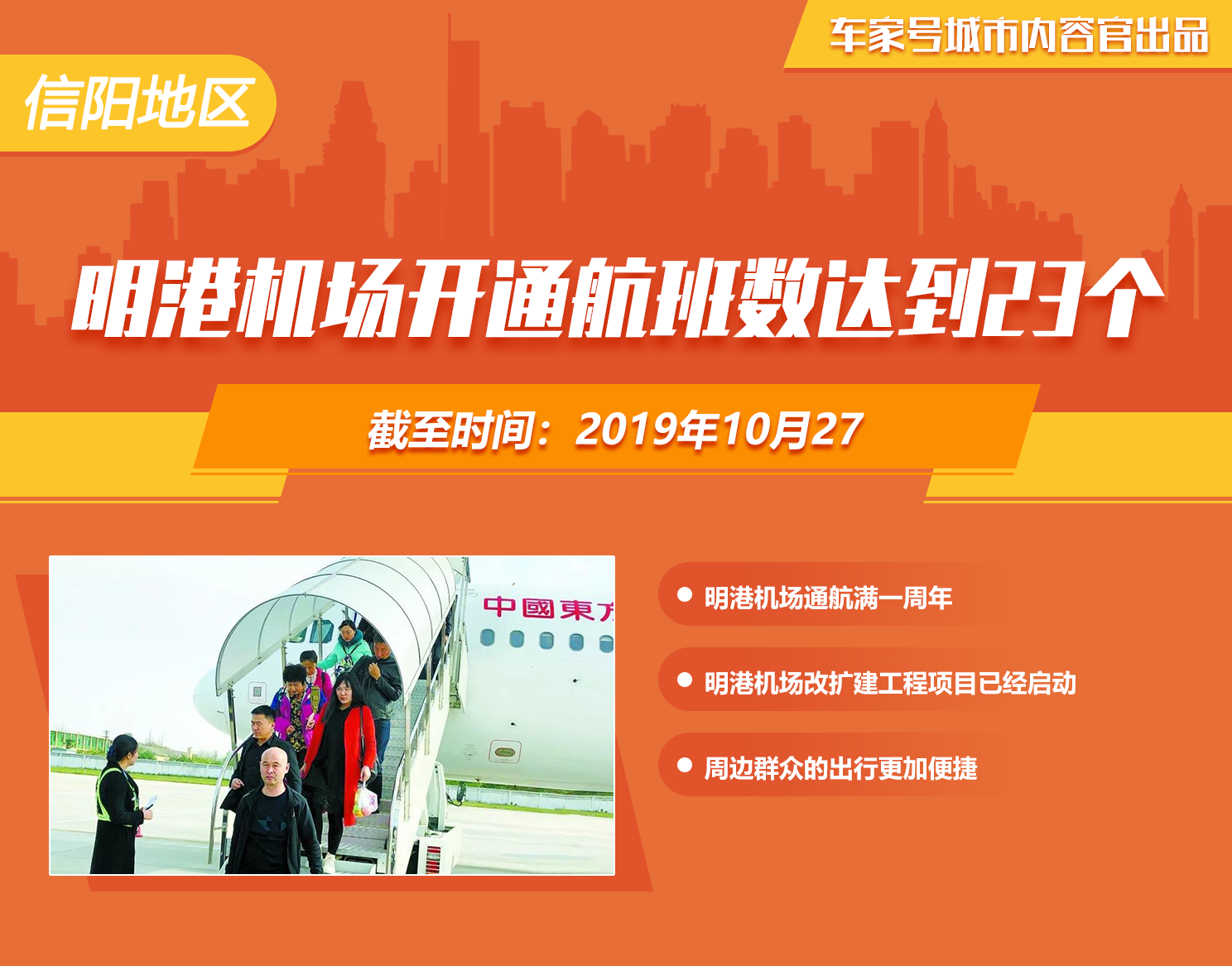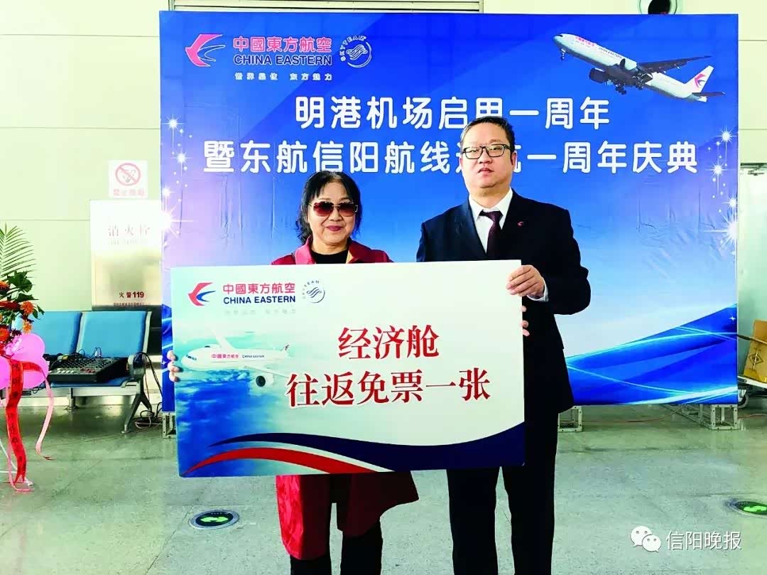 从2018年10月28日至2019年10月27日,信阳明港机场已经通航一年。10月27日上午,明港机场启用一周年暨东航信阳航线通航一周年庆典活动在信阳明港机场候机楼举行。活动现场到处洋溢着喜悦的气氛。