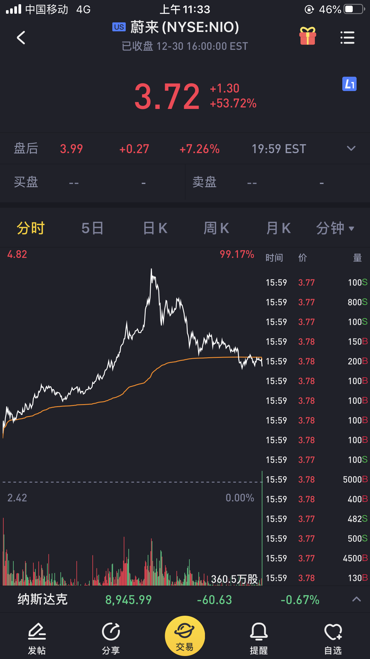 受蔚来Q3财报优于预期的利好影响,蔚来股价在美国股市实现了报复性反弹,盘中大涨100%,并最终以53.72%的涨幅报收。
