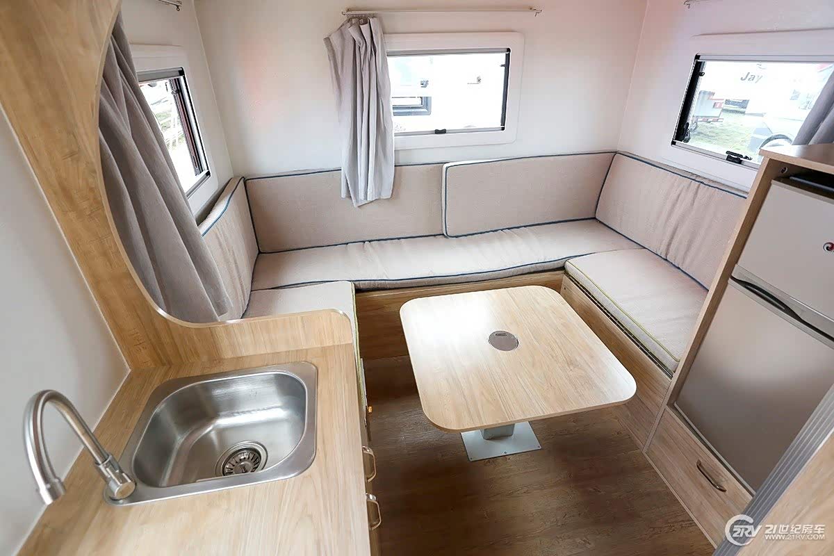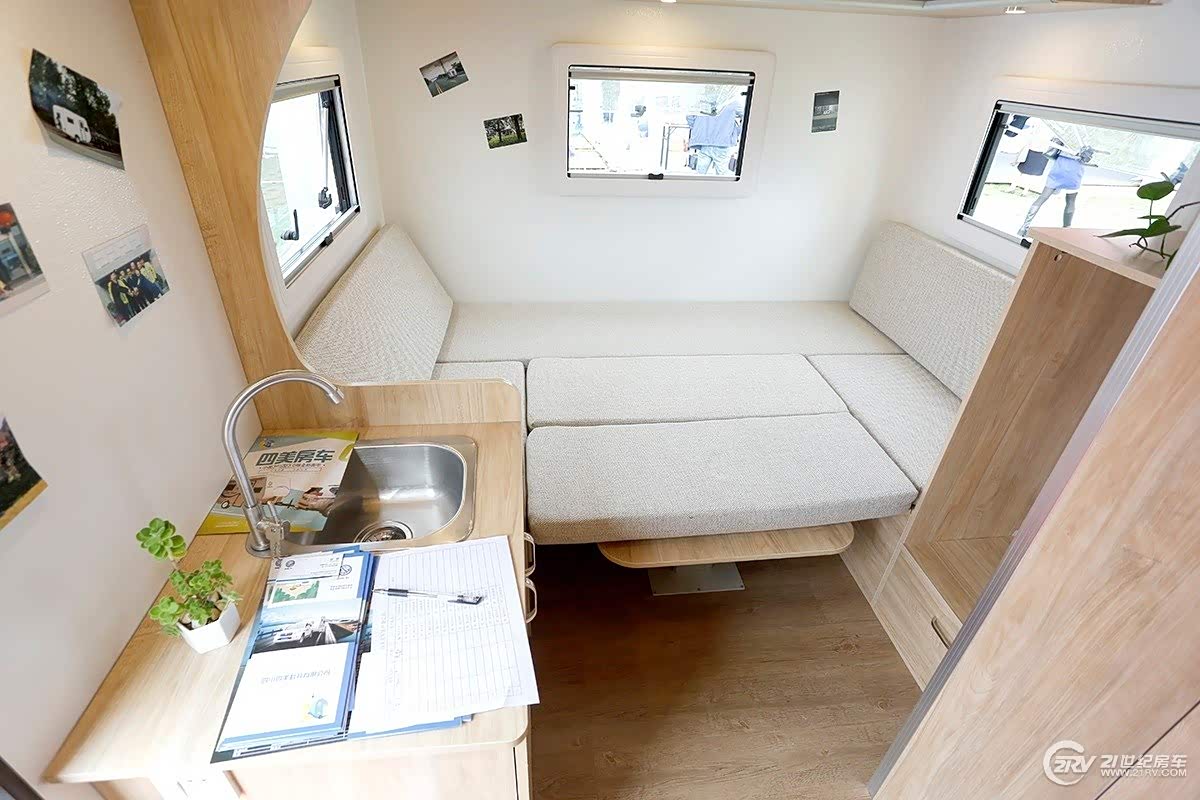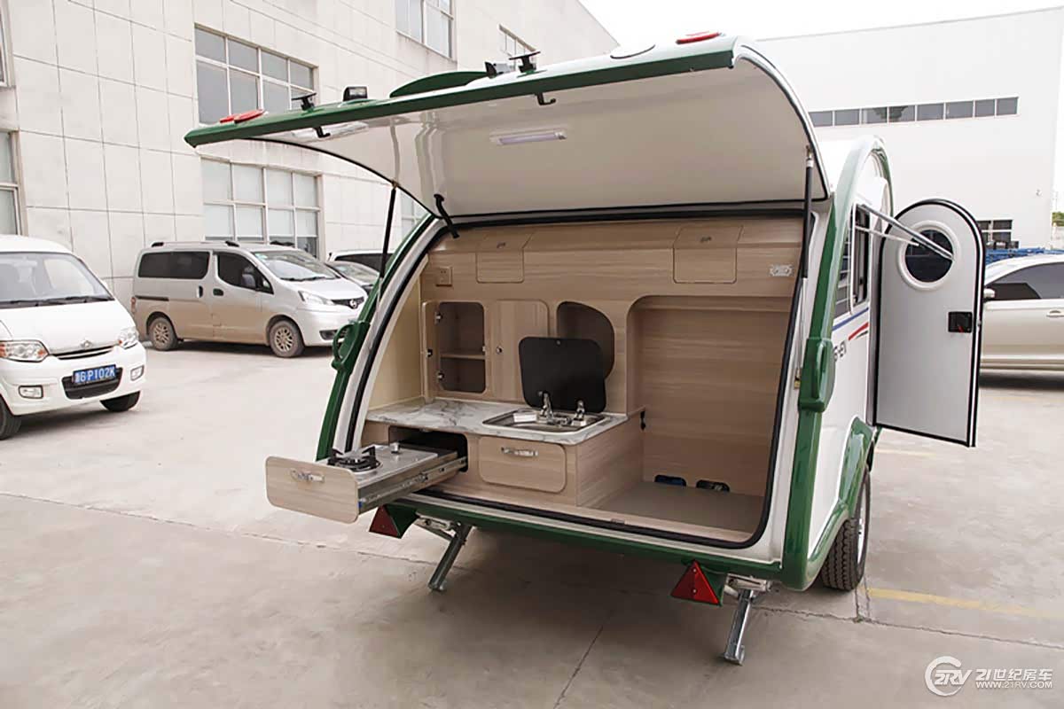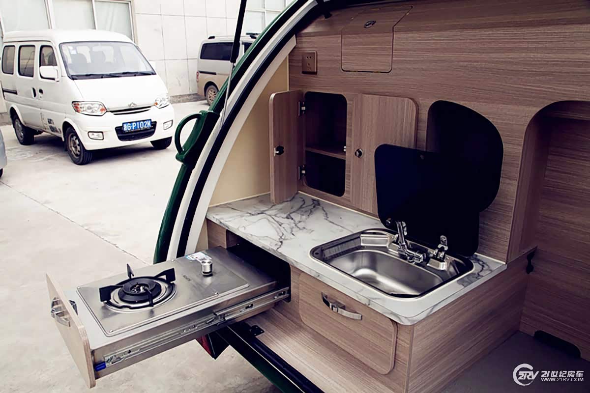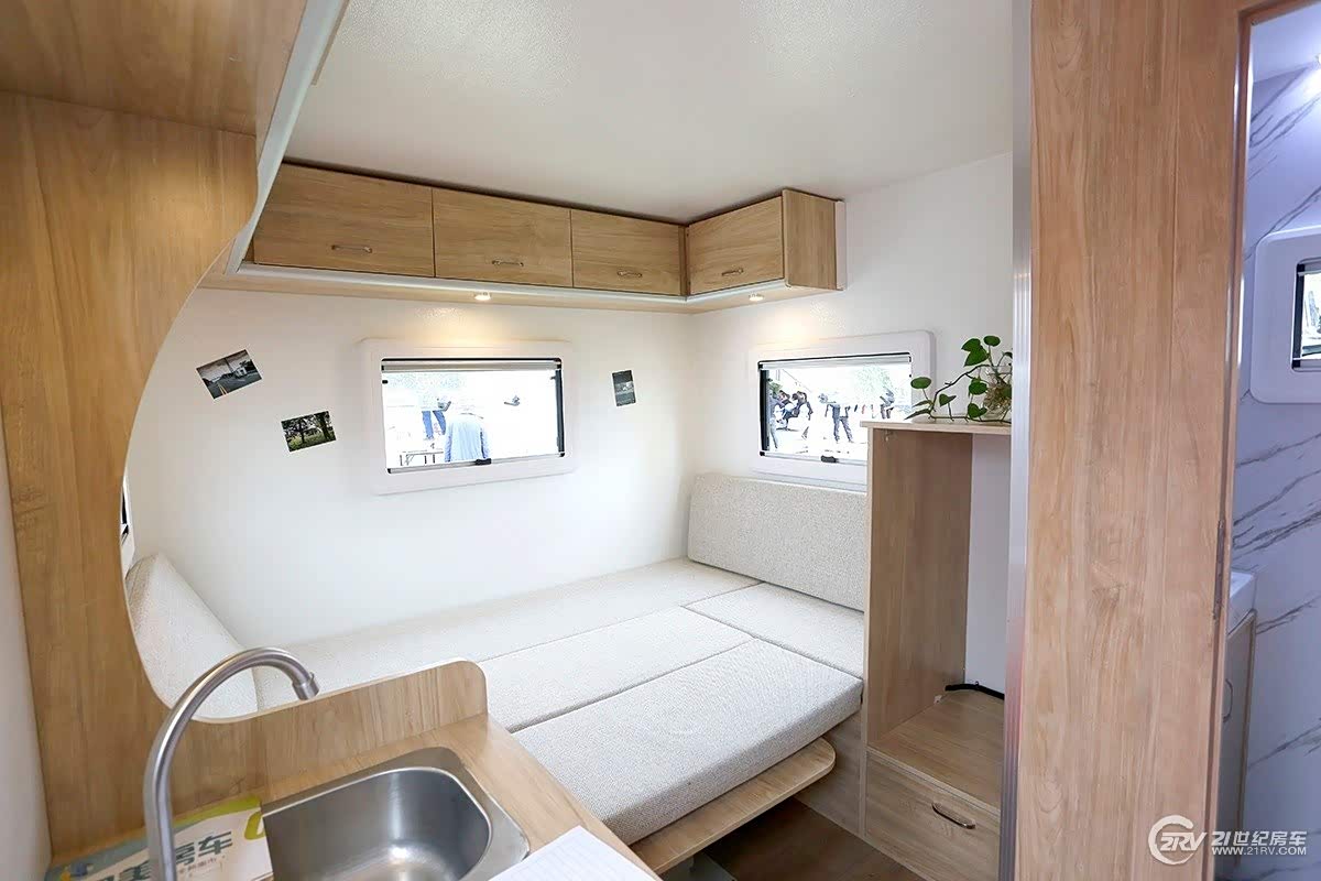 飞神小水滴迷你拖挂房车房车分为三大部分,分别为厨房区、休息区和工具箱。另外,根据客户需求,“小水滴”房车还可以加装淋浴系统、卫生间、太阳能供电系统等。其中休息区配备有U型沙发,中间有一张可折叠长方形的小桌子,巧妙的是,桌子放下后,休息区就变成为1.5米×2米的大床。车内配备24寸液晶电视、DVD和高品质喇叭,为旅行生活增添乐趣;厨房区位于房车后部,与休息区隔开,打开后盖就能看见,配备抽拉式灶具、带盖式洗手池等。