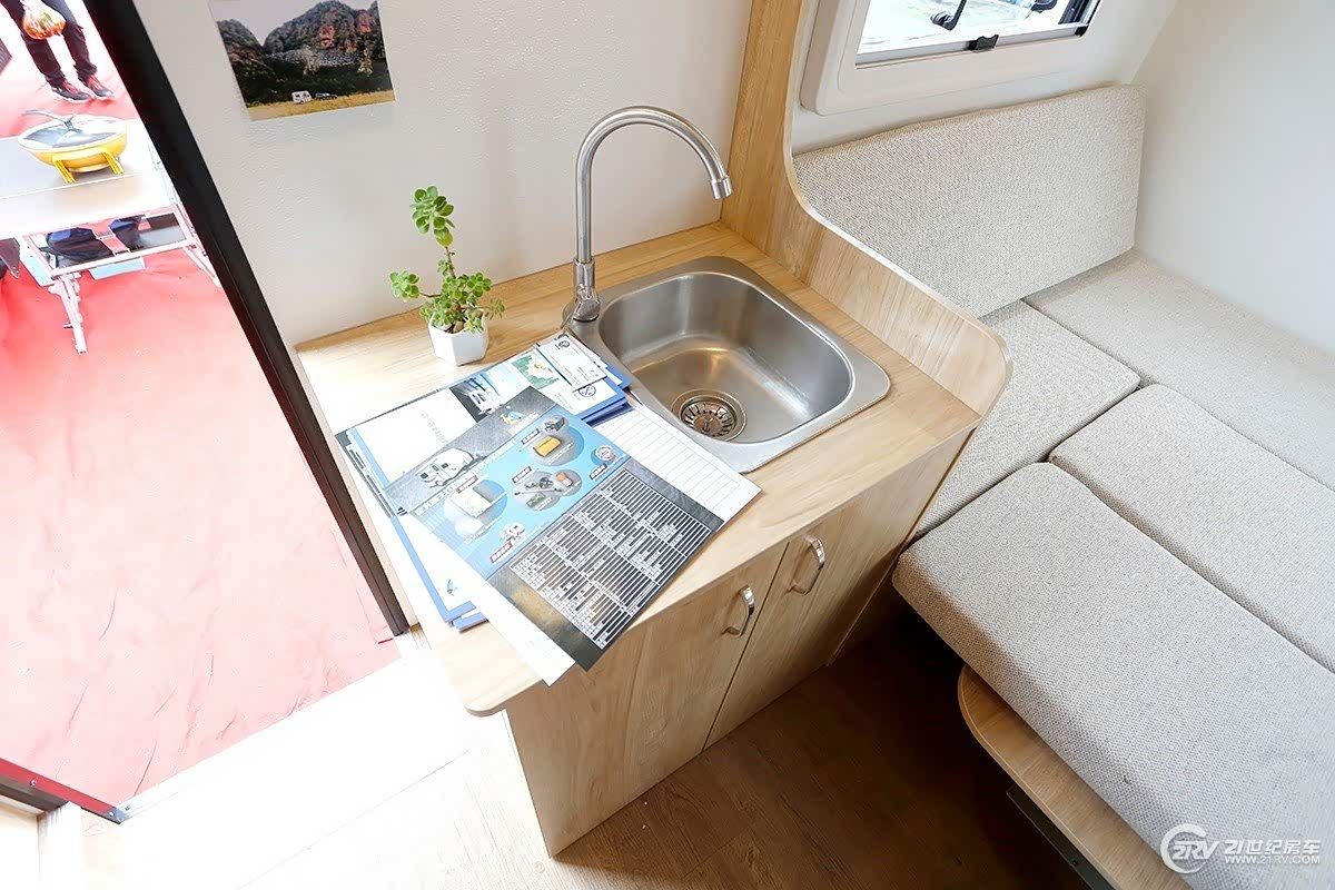 厨房位于车厢中部,配备不锈钢洗手池等,对面配有102L车载冰箱及多组储物柜等;卫生间采用干湿一体式设计,内部配备便携式座便器,洗手池,抽拉式一体式淋浴花洒等。水路系统方面,净水箱容积为100升。
