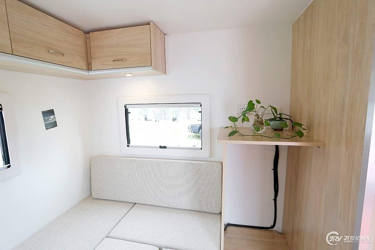 整体空间布局紧凑,室内板材采用原木材质,色调偏暖色系,给人一种温馨的感觉。车厢前部采用上下床卧铺设计,车尾部分是一张大U型沙发,也可以转换成一张尺寸为2140×1300(mm)的双人床。车内配置可以根据用户需求进行加装;可以基本满足2-4人(2大人2小孩)的正常睡眠需求。