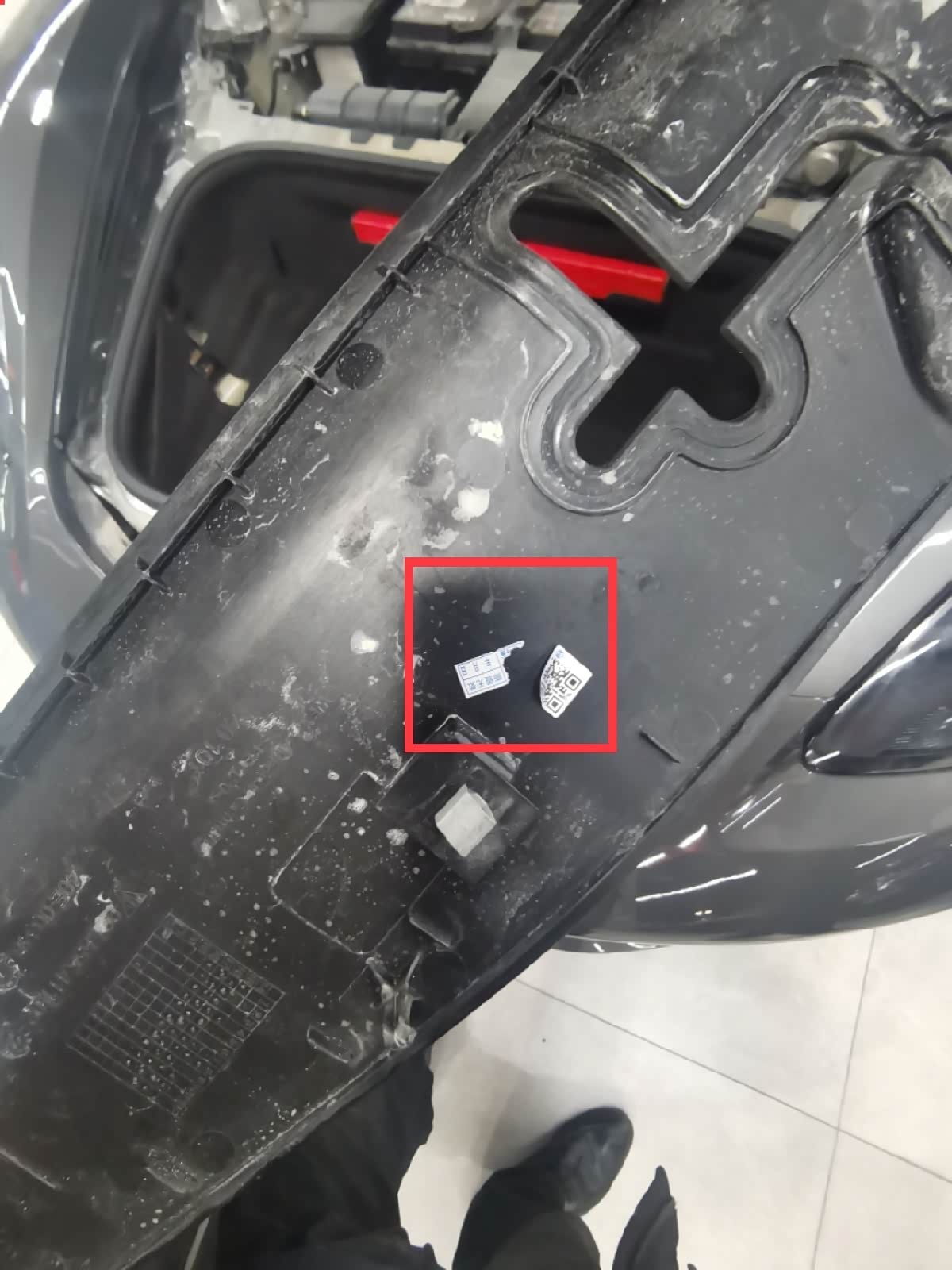 果然发现内测贴了撕毁无效的标签,这个板是后换的,只有换的副厂的件板上才会出现撕毁无效的标签。这个板对车子没有什么影响就是装饰前部用的。综合上面的检测结果可以判断左前存在小事故,换了机盖左前大灯还有前保险杠。但是内侧的骨架没有伤到,这个情况也算是小情况。