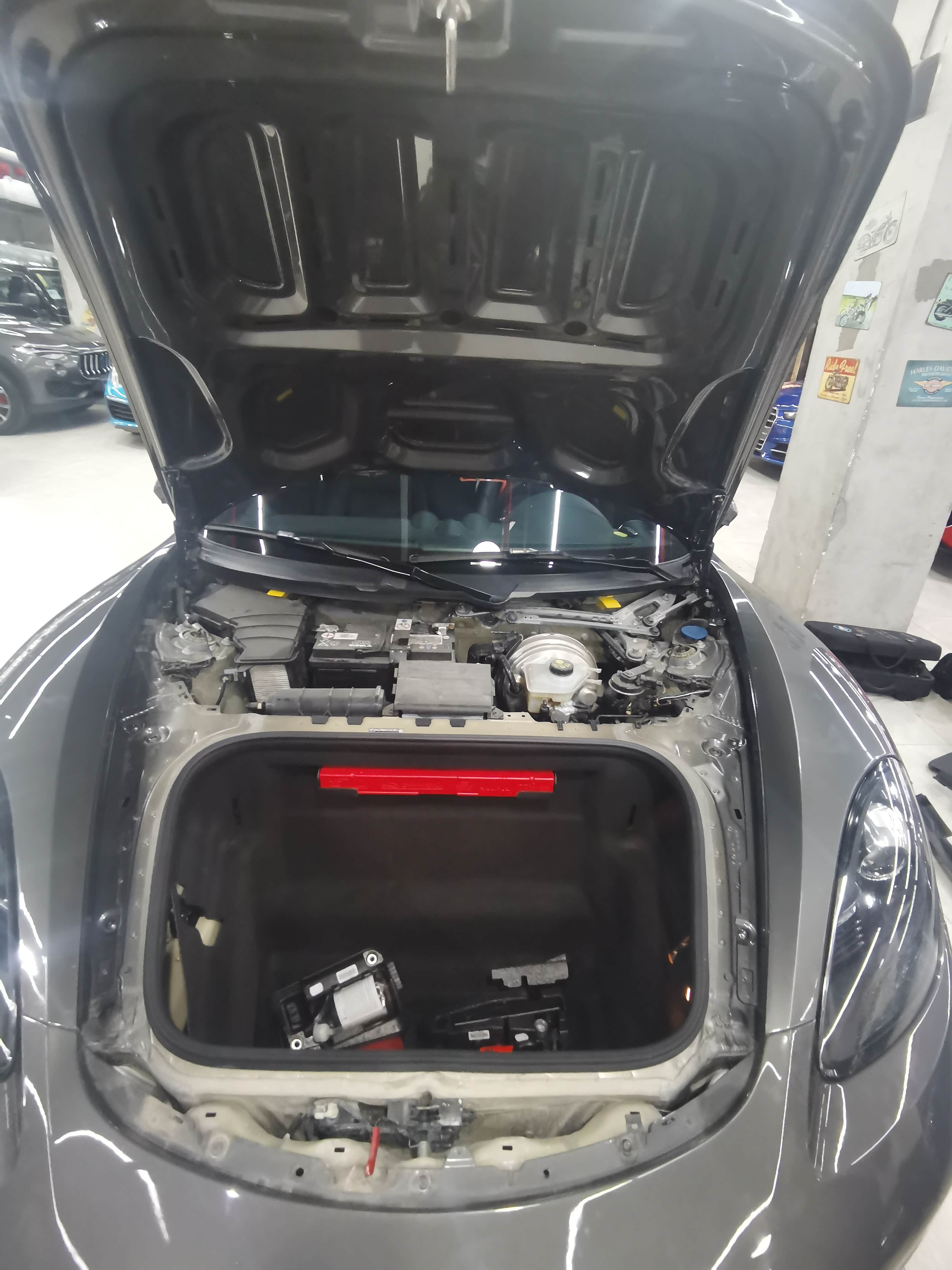 咱们一起看看底盘, Cayman不同于911的后置发动机,而采用了中置发动机,使得它具有前后双行李箱设计,令这款双门跑车最多可提供410L的储物空间。底盘看着还是比较规整的。