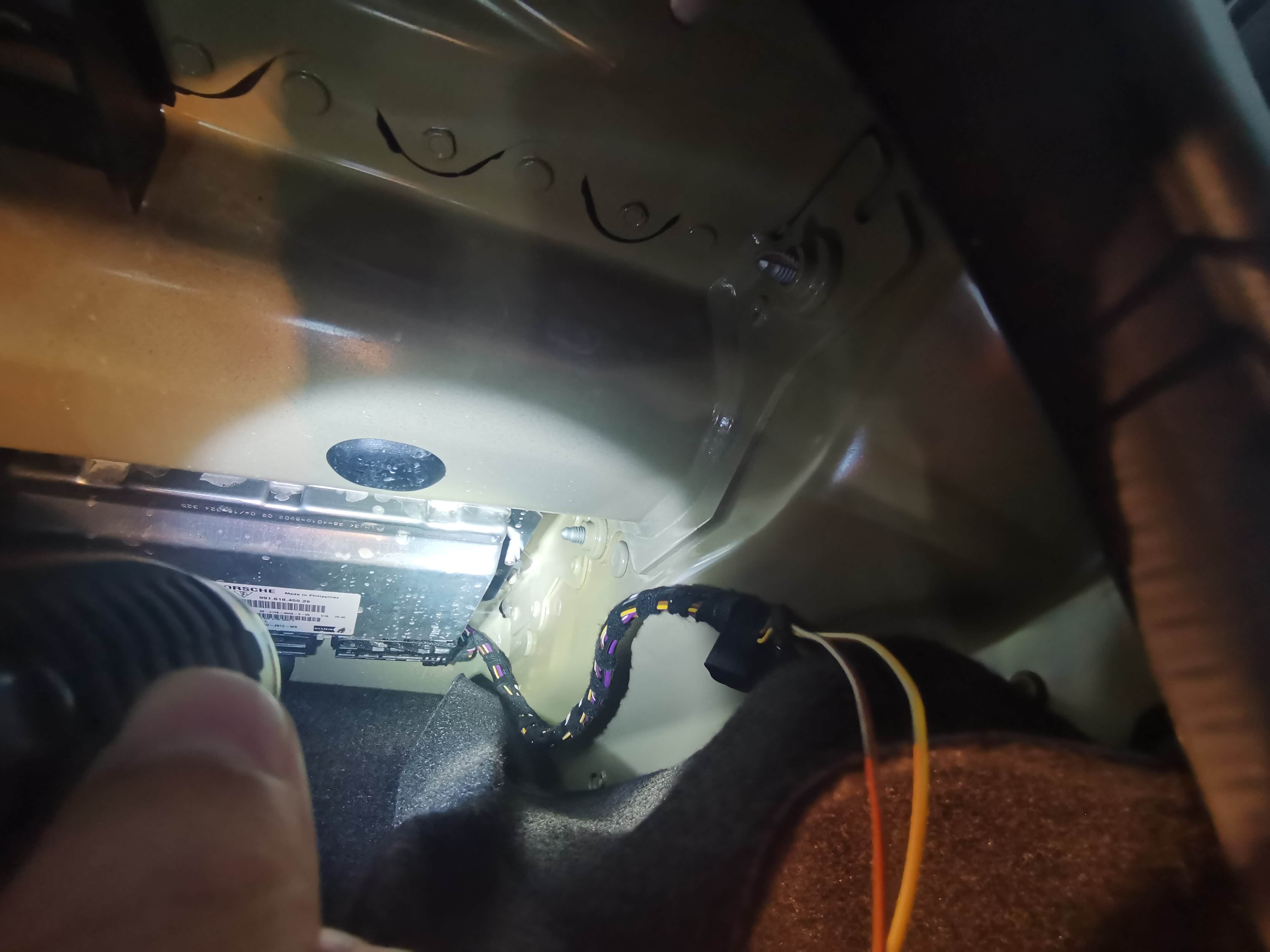 咱们一起在看看前围板有没有伤到,围板内测还是比较规整的没有发现敲打修复的痕迹,但是机盖锁螺丝有拆卸,内测螺丝上一圈拧动的痕迹。应该是调锁的位置了,毕竟机盖是后换的原来位置多少会有些错位。