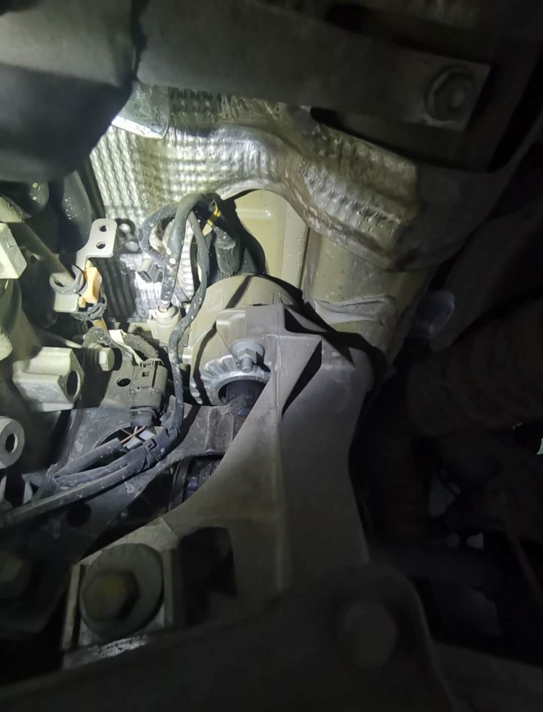 小东把头猫到了底盘内测,发动机鸡爪没有发现拆卸的痕迹。一般大修发动机和变速箱这个部位是必须拆卸的,不然无法进行吊装,小东又继续检查了局部的附属件螺丝,均没有发现拆卸的痕迹,可以排除发动机变速箱存在大修。