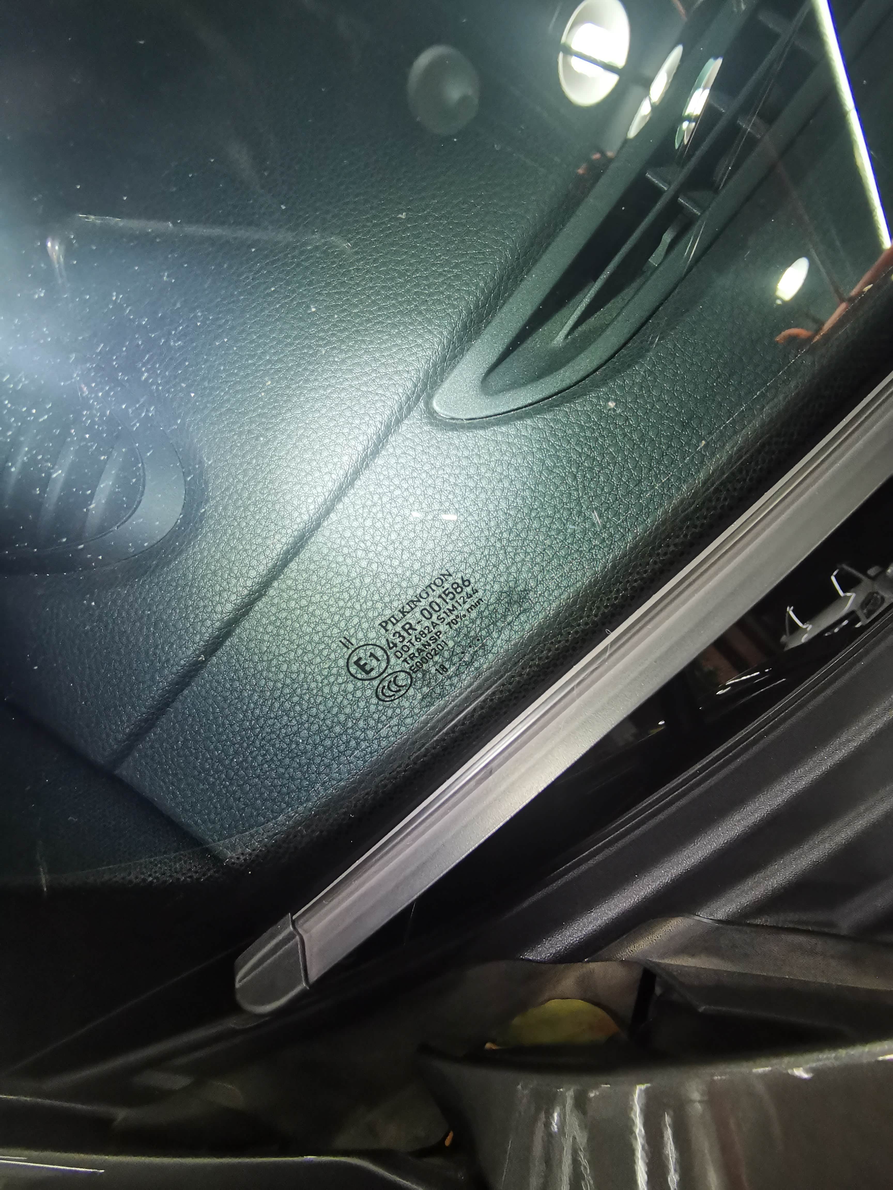 接着咱们再看看前挡风玻璃,玻璃和车子的出厂时间可以匹配上没有更换过,看来前部的事故不大,不然玻璃肯定也会换的。接着小东又检查了其余的车门玻璃,均没有发现更换的痕迹。咱们继续看看车内