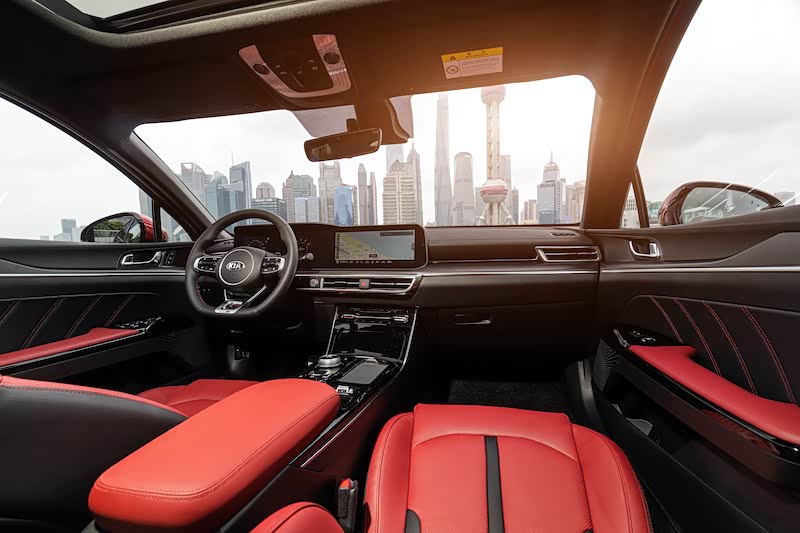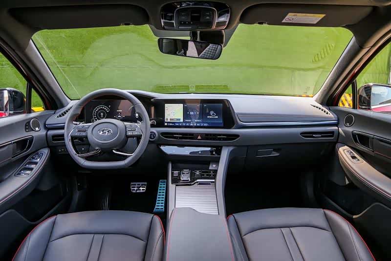 至于车内,国产第十代索纳塔与海外版车型并不相同,它采用时下流行的贯穿式双连屏的设计,而且液晶仪表盘和中控屏幕都将达到12.3英寸,材质和做工方面也有着大部分软性材质覆盖,配合红色缝线营造了不错的质感。