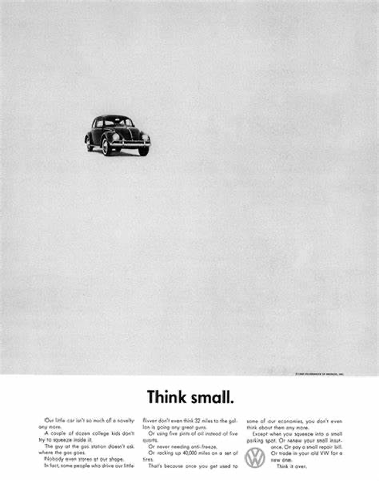 广告大师威廉·伯恩巴克以一句简单而有力量的广告语“Think Small”,让许多人对甲壳虫产生了深刻的印象。这个广告战役打了三四年,甲壳虫的销量也从15万量突破100万。