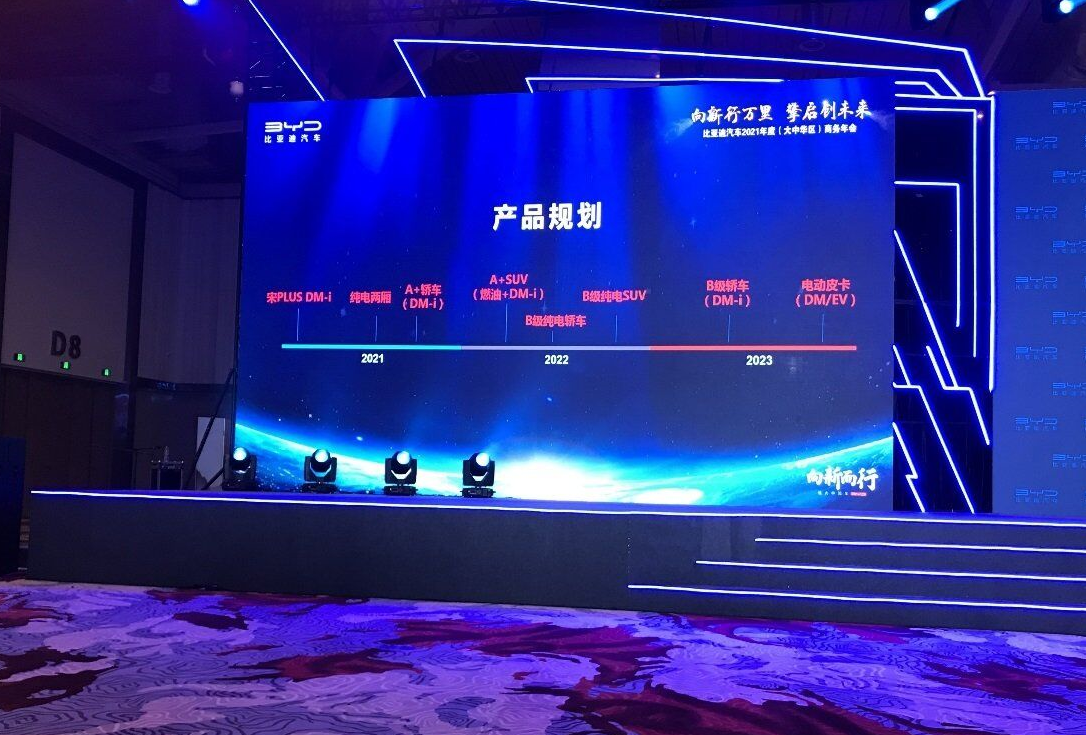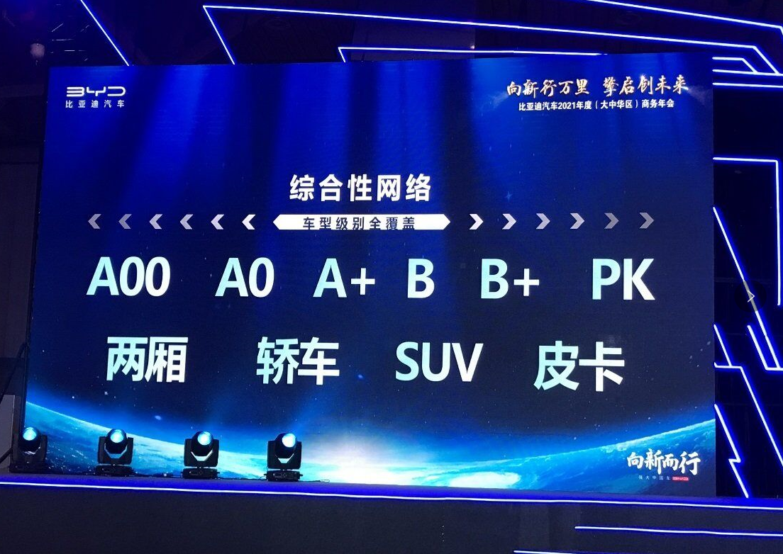 据悉,3 月 18 日,比亚迪举行了比亚迪汽车 2021 年度(大中华区)商务年会,在会上,比亚迪明确展示了未来的车型覆盖规划。