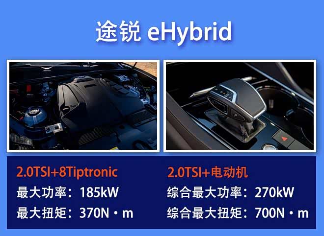 与普通燃油版车型相比,途锐eHybrid最大的区别就是来自动力系统的区别。其中2.0TSI发动机就可爆发185千瓦(252匹)的最大功率以及370牛米的峰值扭矩,再加上电动机的帮助,这套系统拥有综合270千瓦的最大功率、700牛米的峰值扭矩,配合上8速手自一体Tiptronic变速箱以及4motion四驱系统,可以让这台途锐eHybrid从静止加速到100km/h仅需5.7秒。