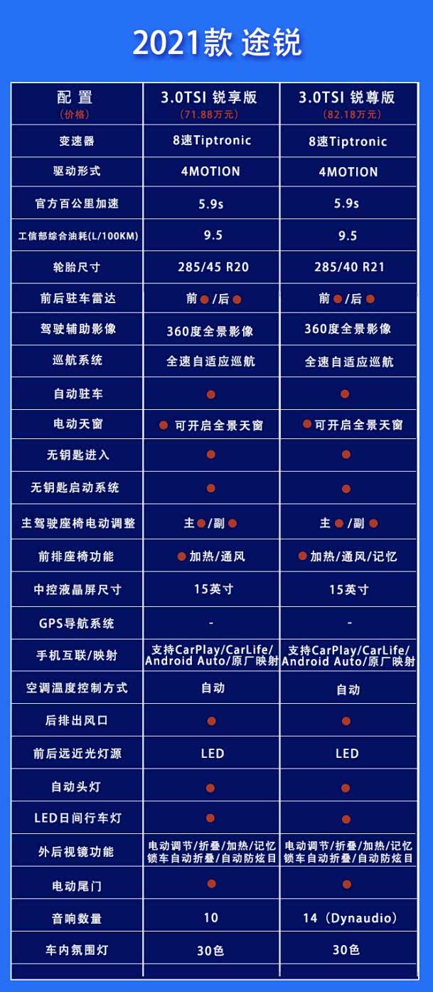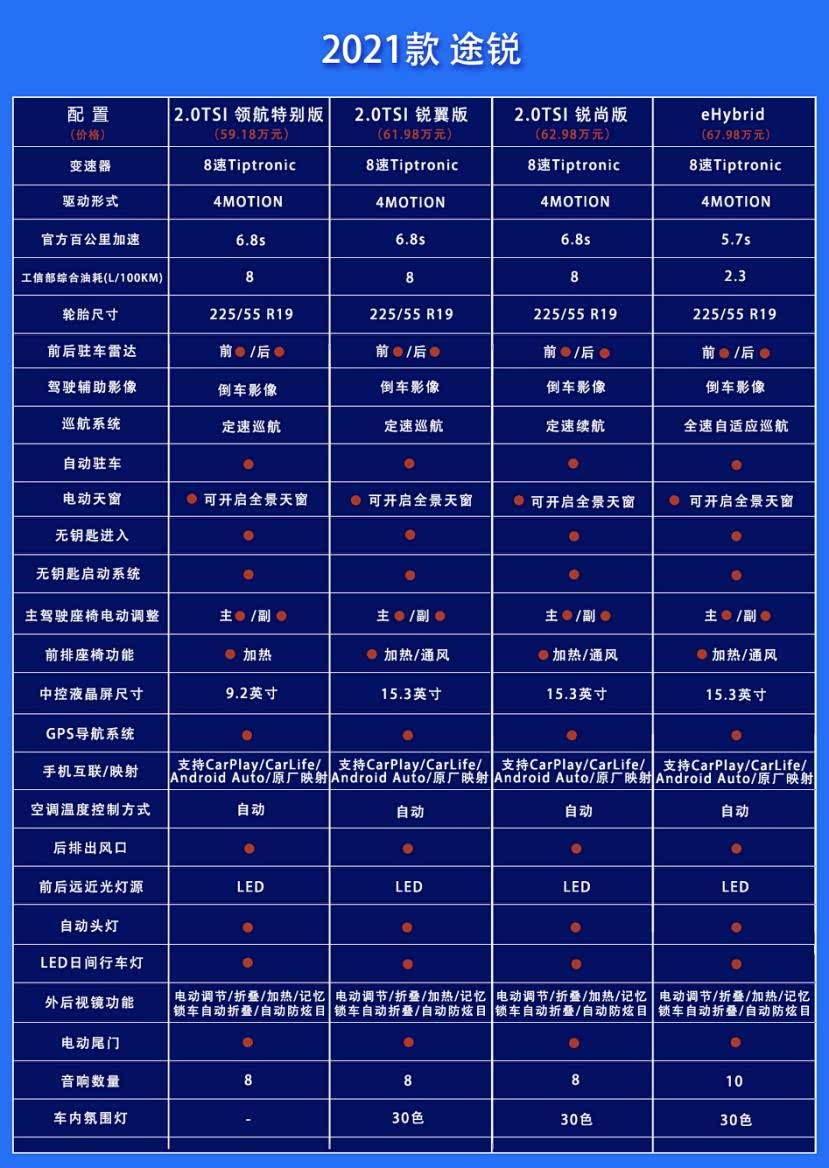 综合2021款途锐全系车型的配置来看,无论是插电版还是燃油版车型标配的配置都相当丰富。但由于插电版以及燃油版车型的侧重有所不同,燃油版车型标配的空气悬架并没有在插电版车型上出现,相对来说燃油版途锐有着较强的综合能力,空气悬架对途锐的通过能力有着更显著的帮助。但eHybrid车型更加注重于家用场合以及城市驾驶,可以看出eHybrid车型配备了只有在3.0TSI车型上出现的全速自适应巡航功能,而这套功能中还包含了车道保持系统、交通拥堵辅助系统、盲点监测、并线辅助等多项驾驶辅助功能。此外,超低的燃油经济性也让它成为家用型SUV最值得推荐的选择。