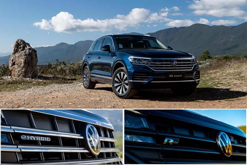途锐eHybrid在外观方面与燃油车型的设计几乎无异,采用了大众家族化最新的设计语言,贯穿式的前脸设计让新车看上去更具张力,在多幅镀铬饰条中网的左侧标示了“eHybrid”字样,燃油版本车型此处为“R-Line”字样标示。