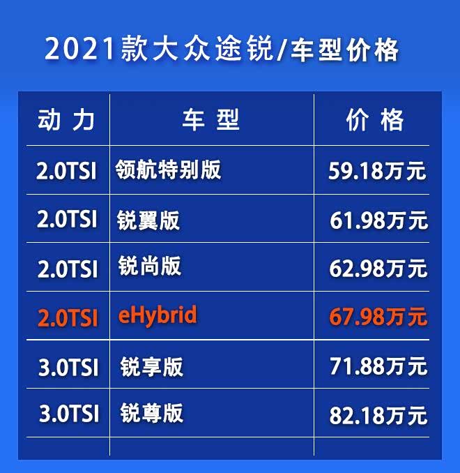 作为大众的旗舰级SUV车型,目前在售的2021款途锐各个车型都有着极高的推荐度。即便是2.0TSI入门版车型,59.18万元的起售价在同级别进口产品中有着无法比拟的性价比。而综合3.0TSI顶配车型的配置及参数来看,82.18万元的售价也显得诚意十足。但根据消费者不同的实际使用需求以及“电气化”时代对汽车市场的不断渗透,售价定在67.98万元的eHybrid车型无论是性价比还是综合各方面实力,都让它成为了旗舰级的“宠儿”。值得一提的是,购买途锐eHybrid还可特享购置税补贴55000万元。