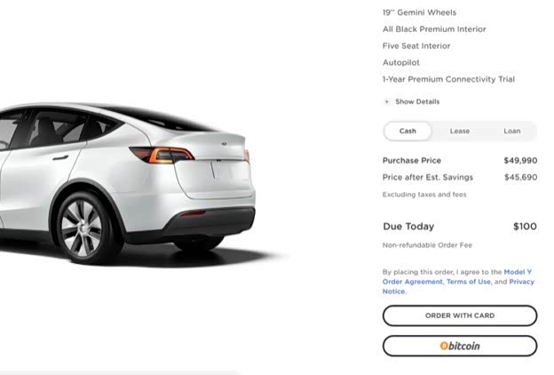 其实纵观整个车企行业,像特斯拉通过投资比特币产生的理财浮盈收入远远大于卖车收入的车企公司,能将车企股值与币圈股值连接的息息相关的,古往今来再也找不出第二个。那么每日浮动的比特币到底该怎么估算买车呢?用比特币买车那不是一会儿一个价了?这事儿特斯拉也好解决,直接通过官网进行一个短暂比特币支付窗口期,购车用户必须在强制短时间内完成比特币交易,否则交易就会直接取消,我们以3月24日当日比特币价为例,当日如果要比特币购买,可以直接用1.8个比特币进行购入特斯拉,不知道之前那个用一个比特币买披萨的小伙儿是不是肠子都悔青了。也真就像咱们老话说的那样,过了这个村儿那可就真没这个店了。