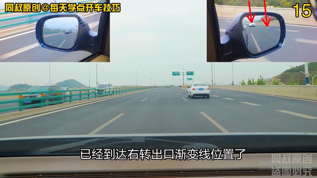 在右侧后视镜中看到,他变道到第三车道后,已经到达右转出口渐变线位置了。