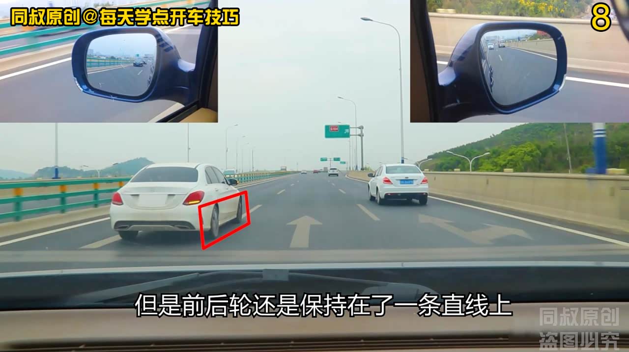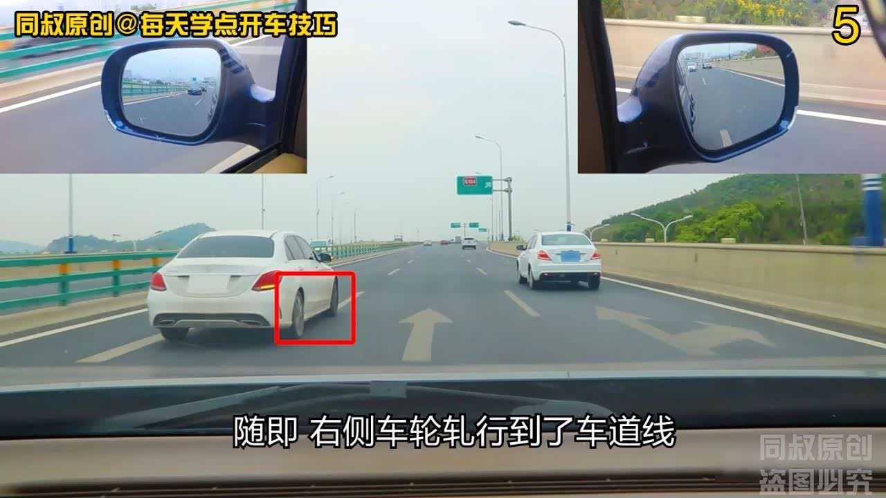 接下来,我们看到他右侧轮胎已经轧行到了车道线,但是前后轮还是保持在了一条直线上,这说明他没有盲目变道,而是试探性的变道。他一边向右侧车道线移动,占位到车道线一带,一边在观察后车的动向。假如我紧急刹车减速,他下一步就会向右打方向变道进来;