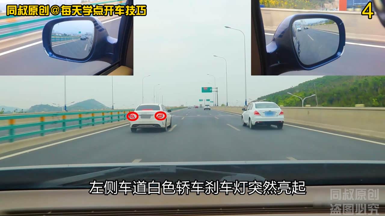 就在我左侧车身刚刚进入第二车道内的时候,左侧车道白色轿车刹车灯突然亮起,