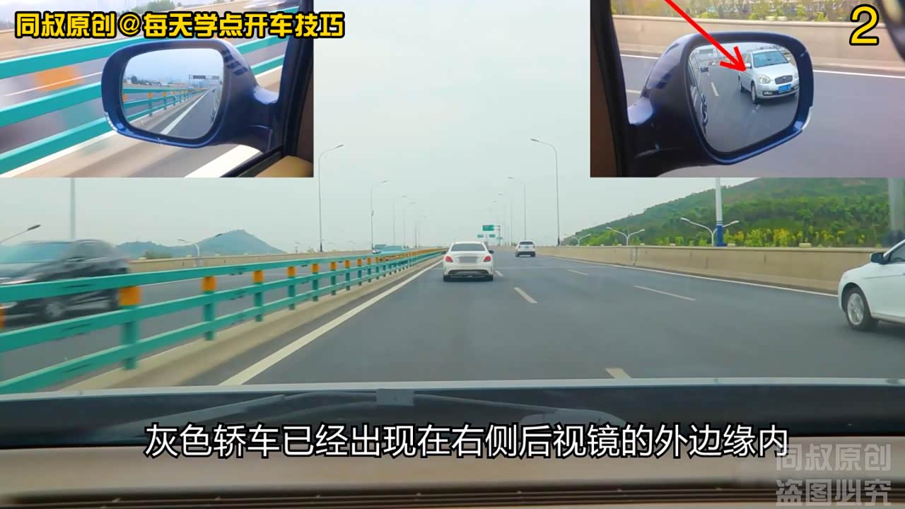 灰色轿车已经出现在右侧后视镜的外边缘内,