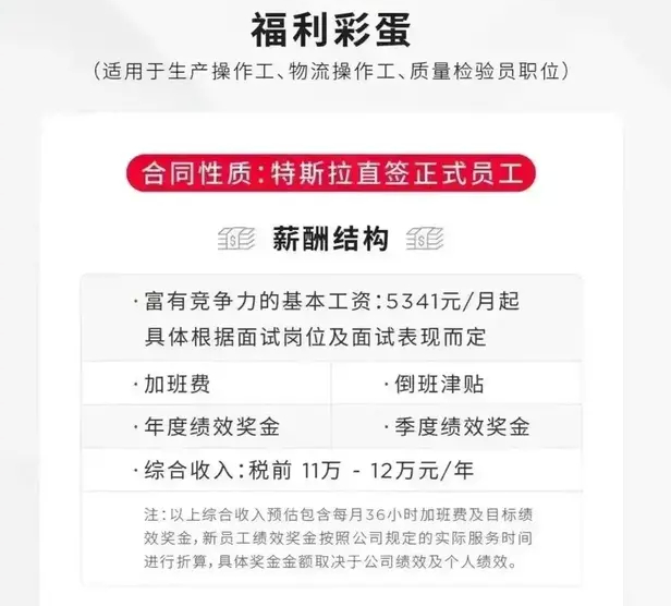 这份薪酬标准是针对特斯拉工厂的生产操作工、物流操作工和质量检验员的岗位,基本工资是5341元起,具体要根据面试表现定。此外,还有加班费、倒班津贴、年度绩效奖金、季度绩效奖金,算下来综合年收入在11-12万元。此外还有五险一金+5%的补充公积金,补充商业医疗保险、法定年假等福利措施。